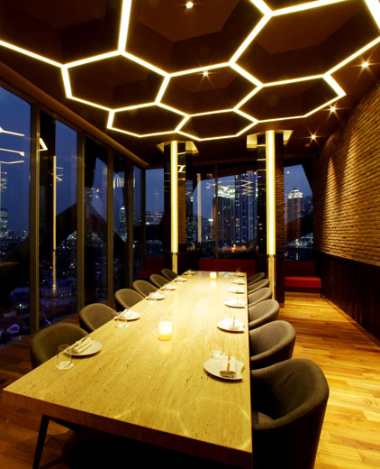 The brand new Akira Back has a modern, minimalist feel – its warm and subdued colours and quirky hexagonal decorations play against the Jakarta skyline, which is clearly visible from the 12th floor of MD Place Building, where the restaurant is located.