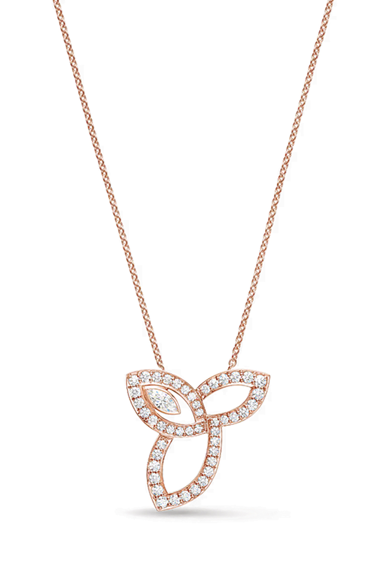 An ode to 18th-century French expression of love, this necklace, set in 18k rose gold, features a dazzling marquise-cut diamond that immediately beckons anyone’s attention. An additional 45 round diamonds lend their opulence to this romantic statement piece.