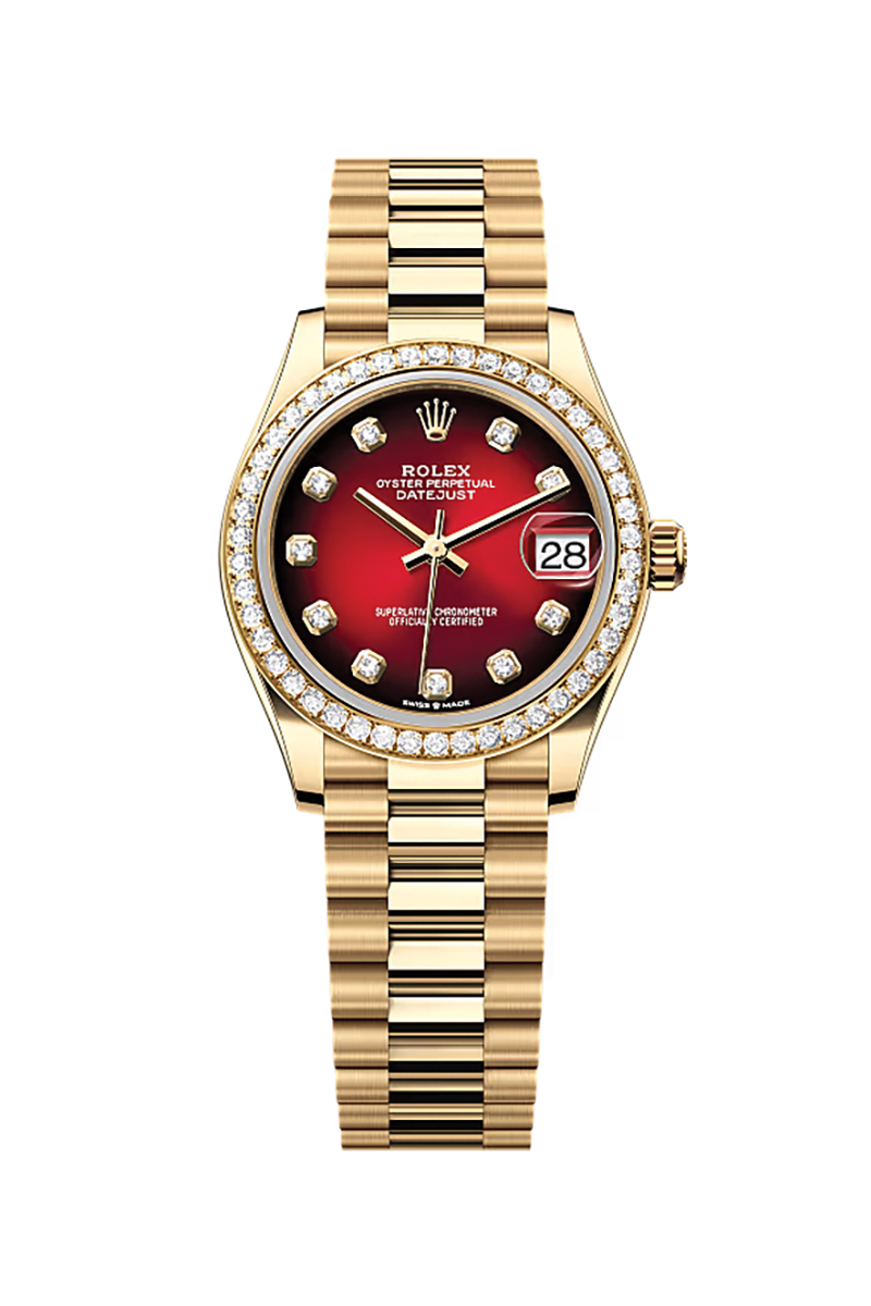 Drawing from the colour palette of a sunset sky, this Light and Shade iteration of the signature Datejust model blends the ombré hues of red with a vibrant gold bracelet and sparkling diamonds, encapsulating the watchmaker’s renowned taste for the refined and opulent.