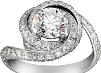 The iconic Trinity is re-interpreted as a bejewelled ribbon of platinum paved with diamonds that coils around the central diamond. A...