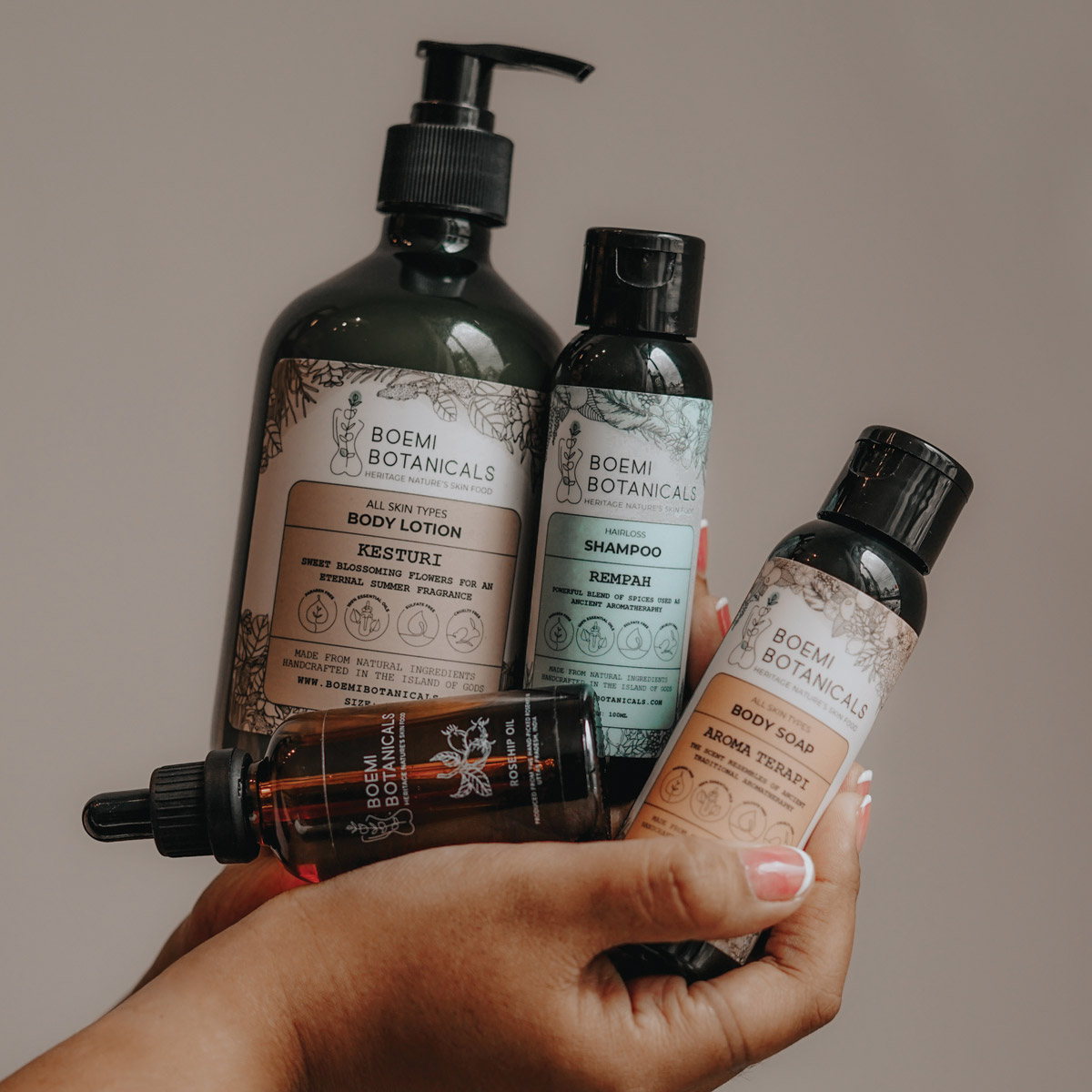 The name BOEMI is rooted from two Indonesian words, bumi (earth) and oemi (woman), two essential pillars for the brand. The products are derived from natural, plant-based ingredients that are beneficial for cleansing, moisturising, covering up blemishes, as well as treating minor skin conditions. BOEMI BOTANICALS’ wide selection includes shampoo, body soap, conditioner, body oil, body butter and body scrub, enhanced with natural scents of Kesturi, Tanabasa, Aroma Terapi, Senja and Rempah.
