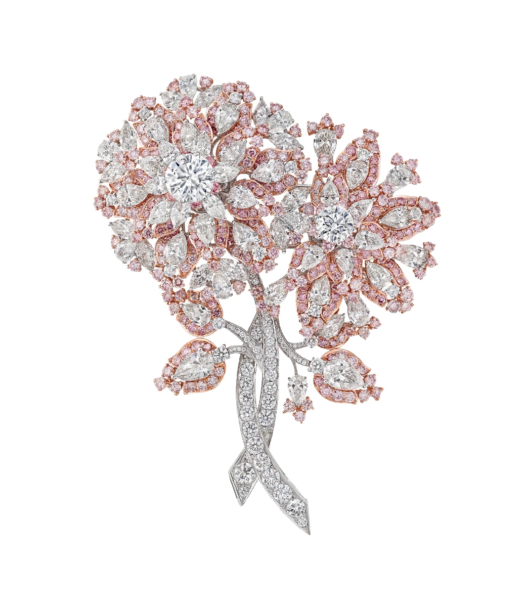 A magnificent tribute to the rare beauty of pink diamonds, this floral brooch showcases nearly 20 carats of vivid pink stones. Composed of 300 pink diamonds, the brooch contrasts against a flurry of exceptional white diamonds across scintillating petals, reflecting the youth of spring and the years of careful sourcing needed to create such a masterpiece.
