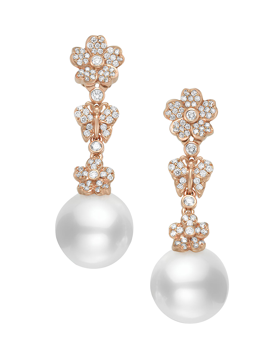 As the most recent iteration of Mikimoto’s Cherry Blossom motif, the earrings depict a delicate five-petal bloom gently expanding around a pearl. With 11mm White South Sea cultured pearls and .5ct diamonds set in 18K pink gold, the silhouette achieves a refined sculptural aesthetic, capturing the quiet poise of a single blossom held in suspension.