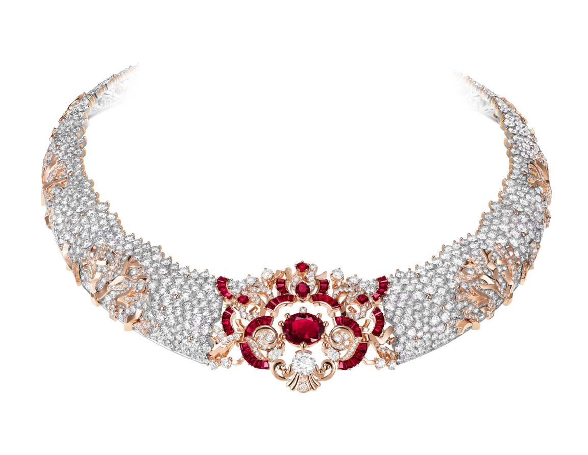 The Récif Corallien necklace captures the poetry of the seabed in 18k rose and white gold, set with a 5.33-carat oval ruby and a 1.01-carat DVVS1 diamond. With these stones creating a luminous contrast, the form echoes living corals’ organic forms and shifting oceanic hues reflecting the vitality of life.