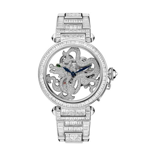 Visible though its sapphire crystal, the calibre 9617 MC in Pasha de Cartier 42MM Skeleton Dragon Motif Watch is exhibited like a creature of fantasy. Set with 233 diamonds, the timepiece is adorned with a marquise-cut tsavorite on the front and entirely engraved on the back and white gold case.